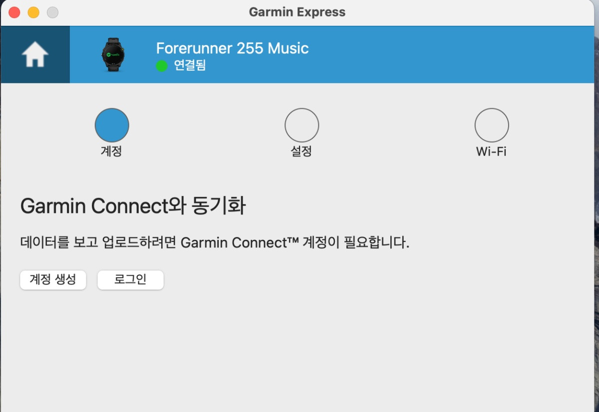 설치 후 실행을 하면, 로그인(회원가입) 그리고 wifi 세팅 및 가민 워치를 등록하면 최종 완료 됩니다.