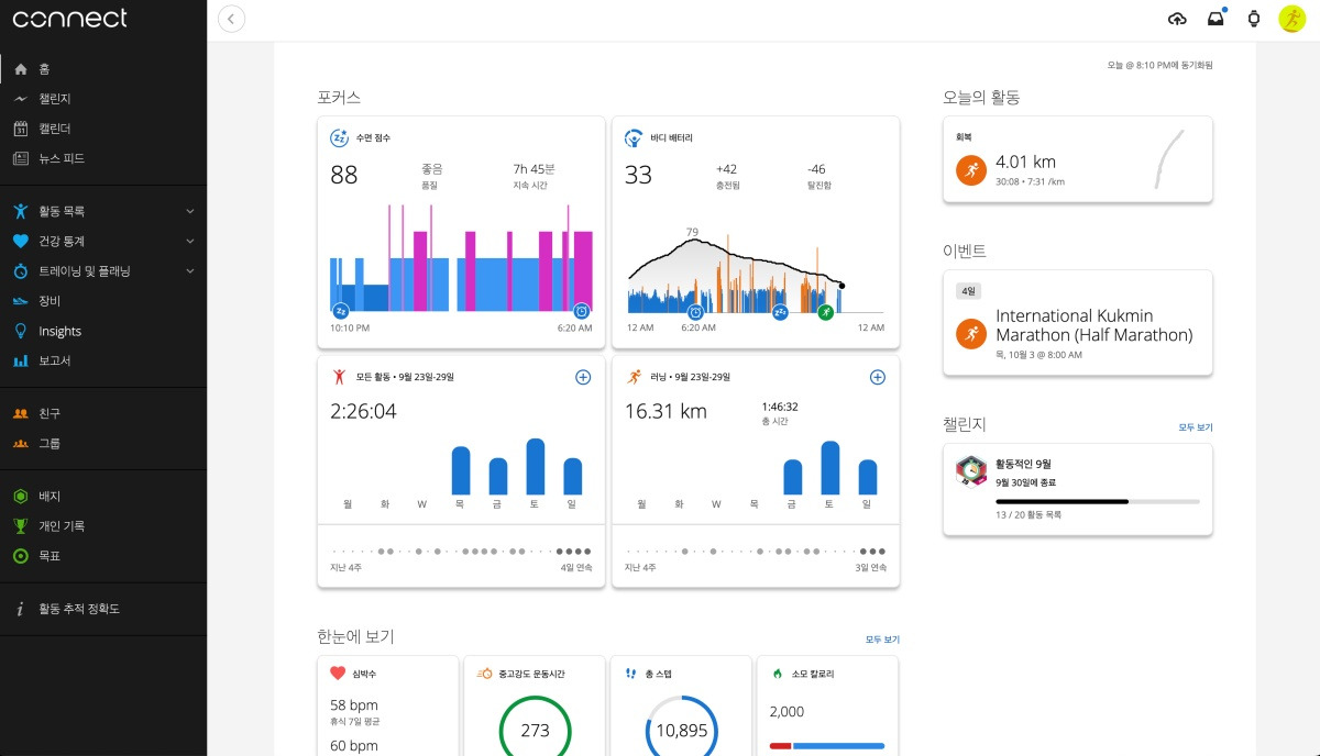 - 가민 웹대시보드 : https://connect.garmin.com/modern/home