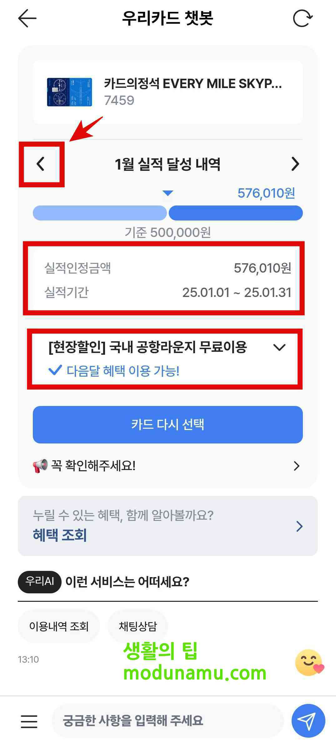 주력카드가 에브리마일 스카이패스가 아니라면 실적 충족 금액이 50만 원이기 때문에 사용할 때마다 틈틈이 체크해야 합니다.