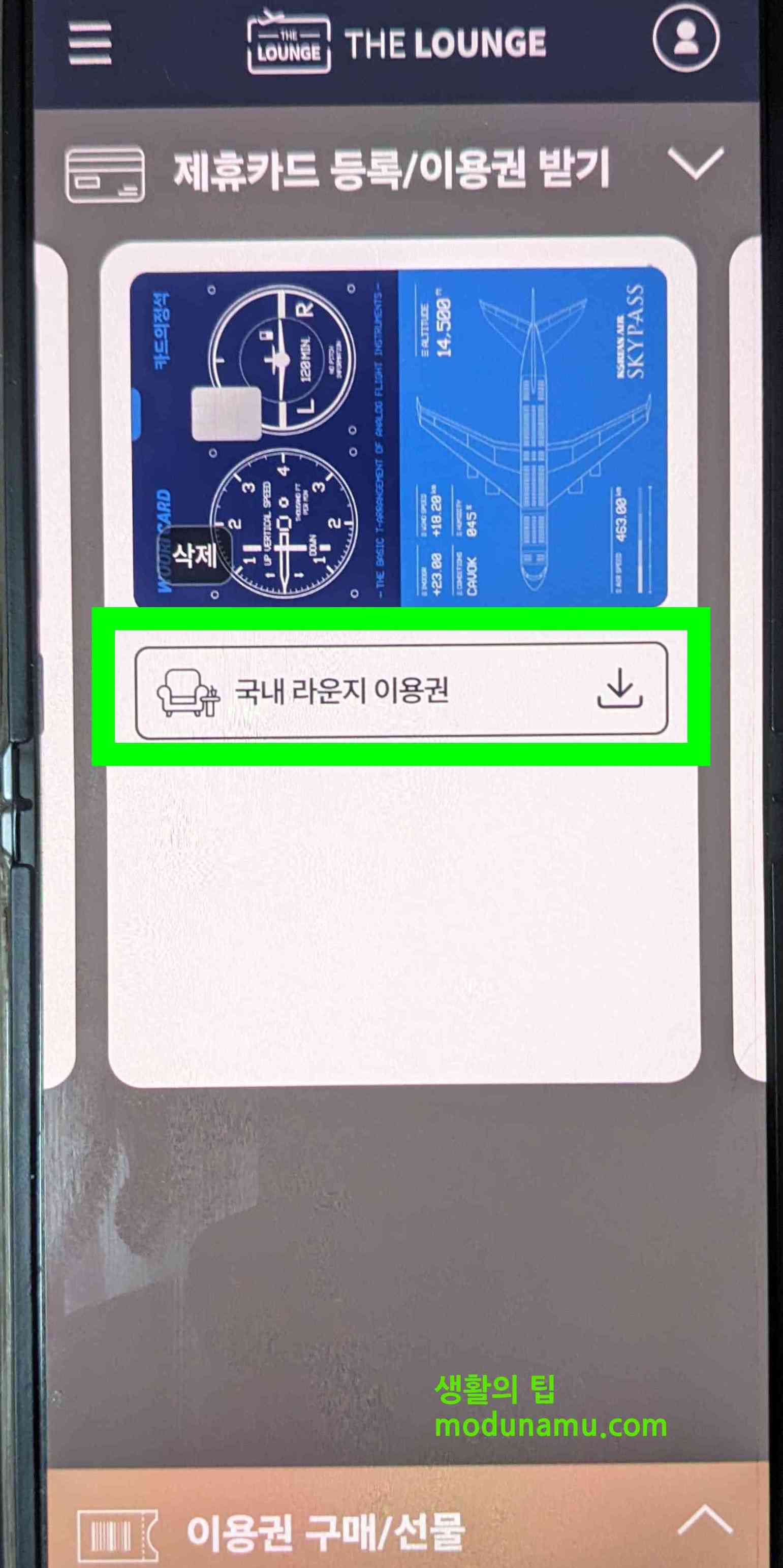 등록을 완료하면 화면과 같이 '국내 라운지 이용권' 버튼이 나와요.