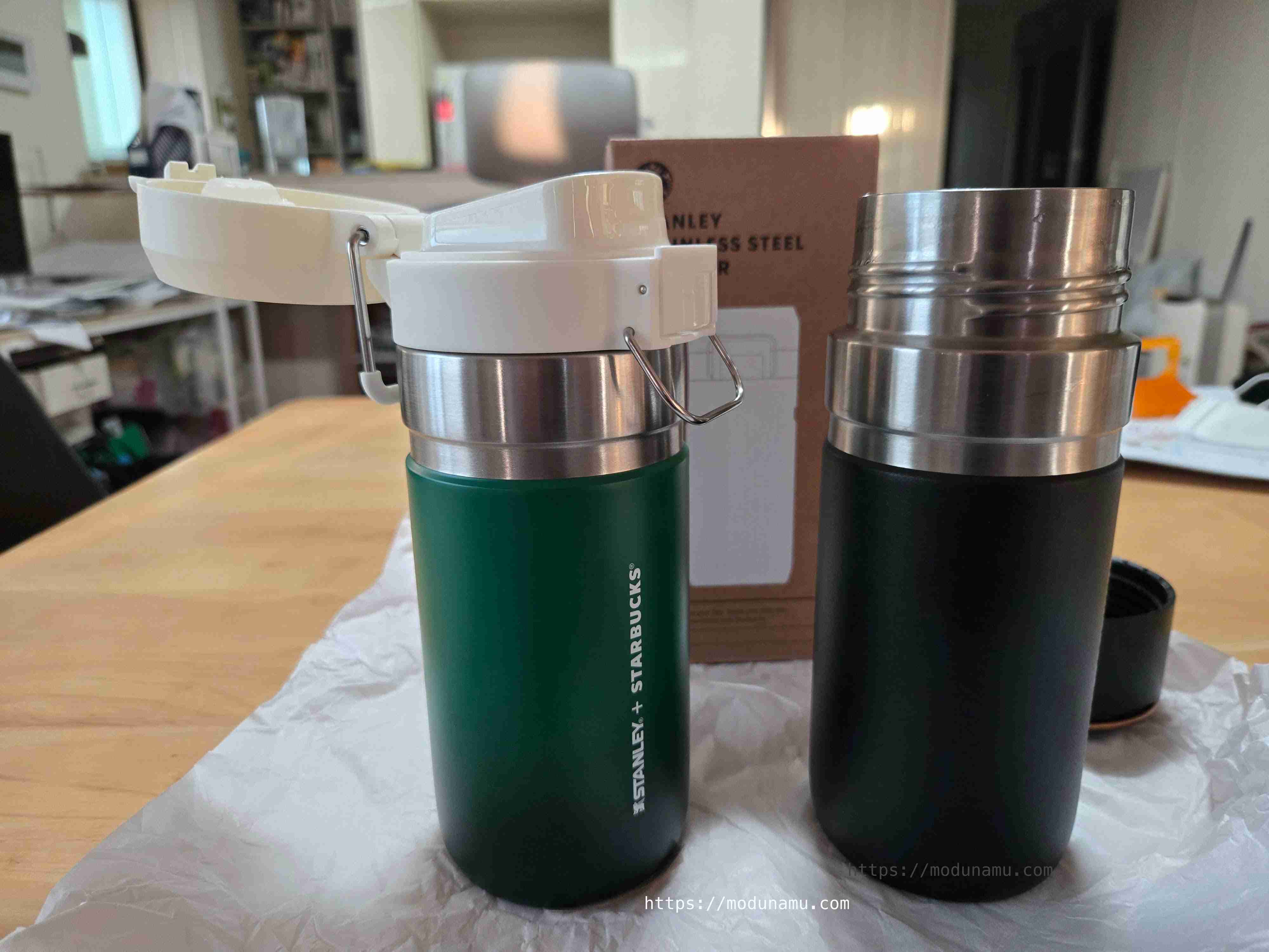 현재 사용하던 텀블러(오른쪽)는 작년에 사서 잘 사용 중인 스탠리 텀블러예요. 스탠리라 그런지 확실하게 보온과 보냉이 정말 잘 됩니다.