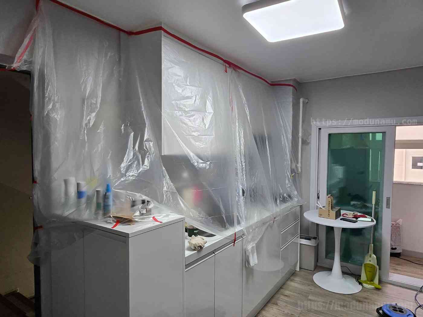 싱크대 등에 먼지가 들어가지 않도록 보양 작업을 하고 공사를 시작해 주셨어요.