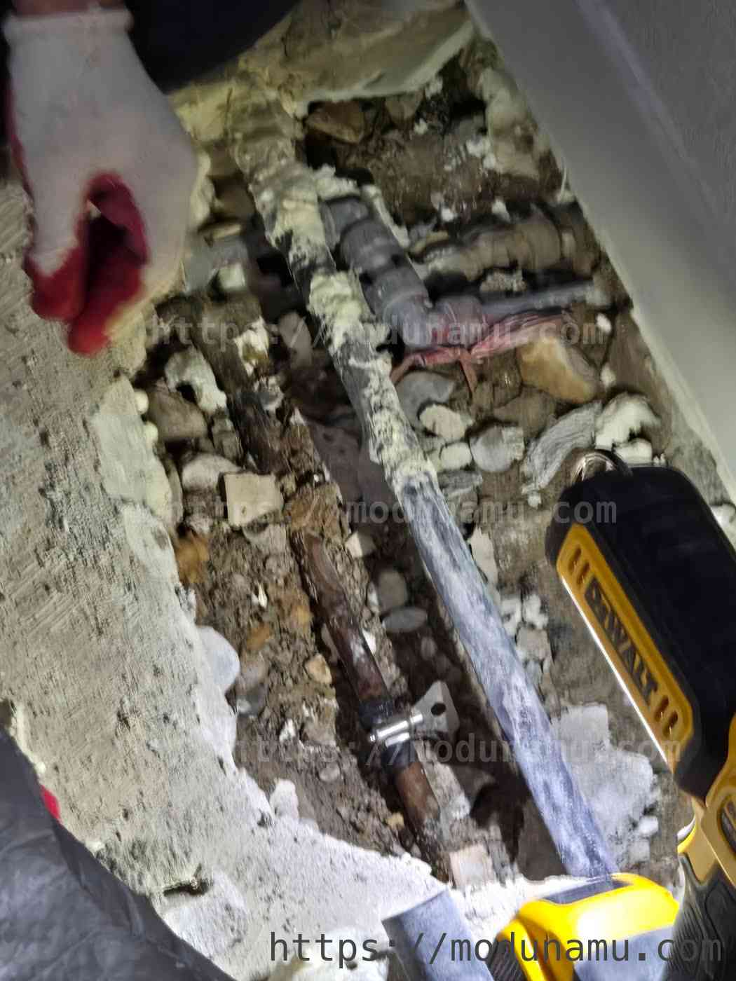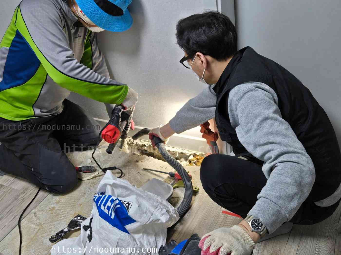 바닥을 조심스럽게 깨 부수기 시작 했습니다. 예상외로 배관이 한개가 아니어서 조심히 작업 했습니다.