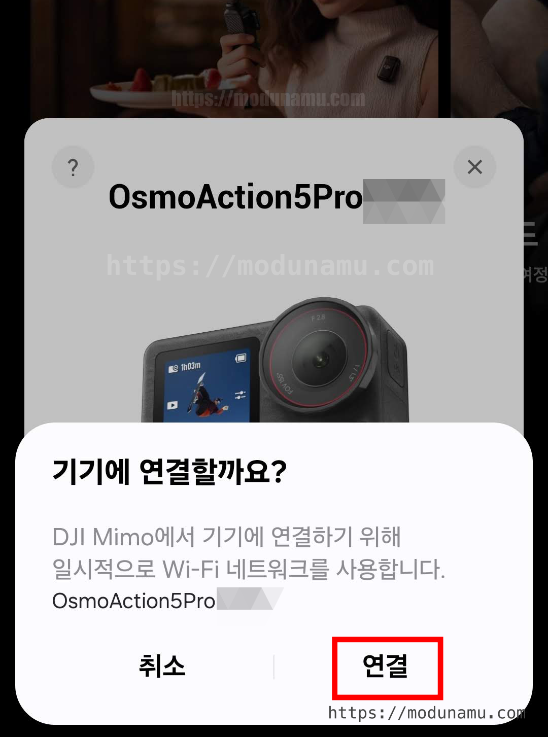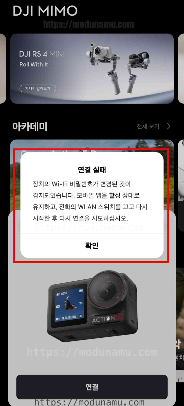 MIMO 앱으로 오즈모 액션 5와 연결을 하면 ‘연결 실패’ 팝업이 나옵니다.