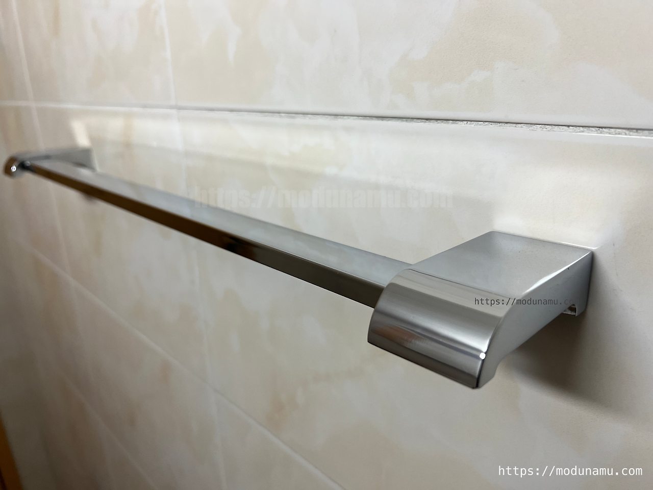 아무리 잘 메꾸어도 타일에 있으면 보기 안 좋기 때문에 저는 기존 수건걸이와 최대한 비슷한 사이즈로 구매해서 자연스럽게 덮이도록 했어요.