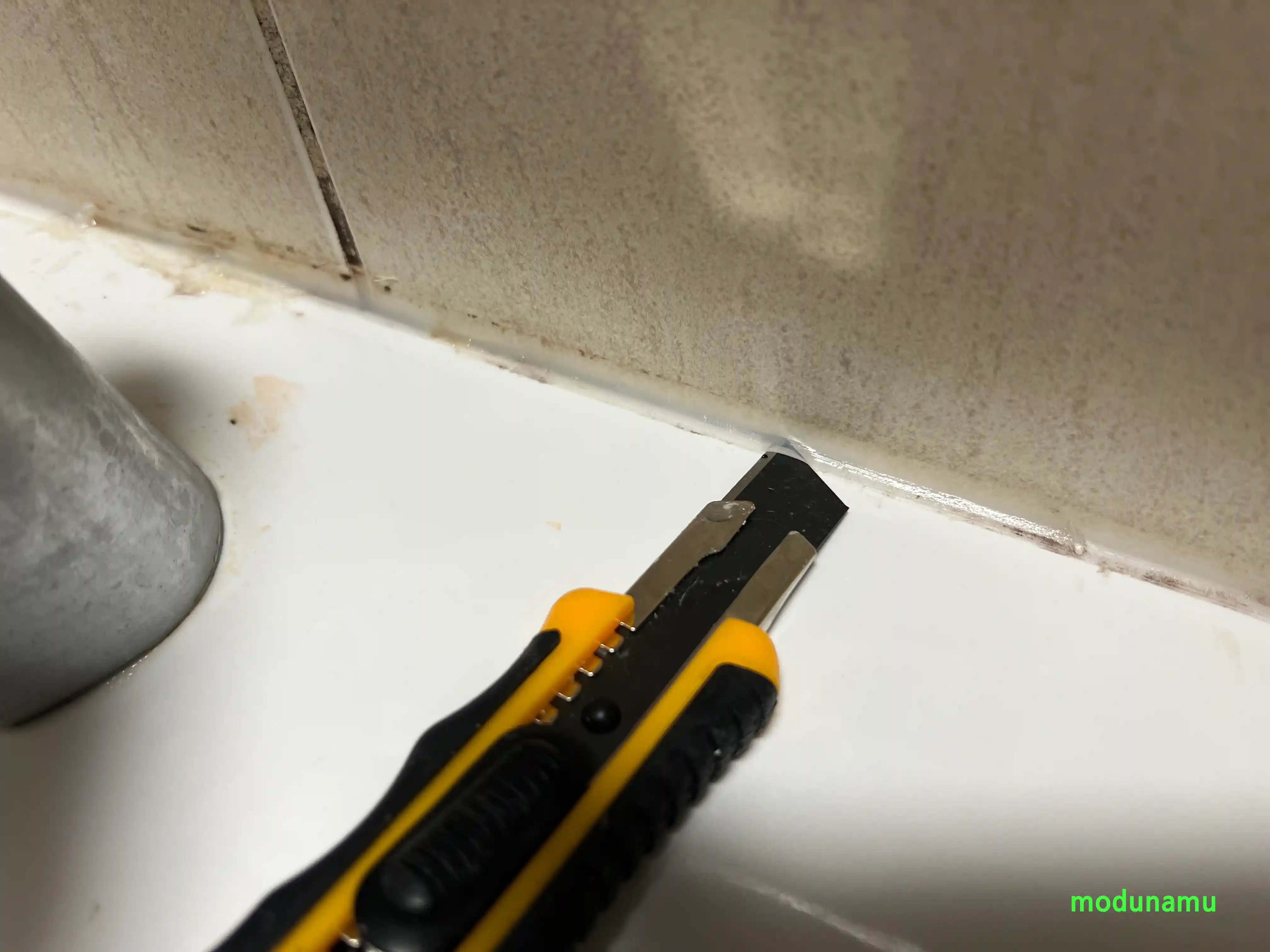 1. 실리콘 제거는 공업용 커터칼로 포 뜨듯이 바닥에 칼날을 밀착시켜 주고 그어 줍니다.