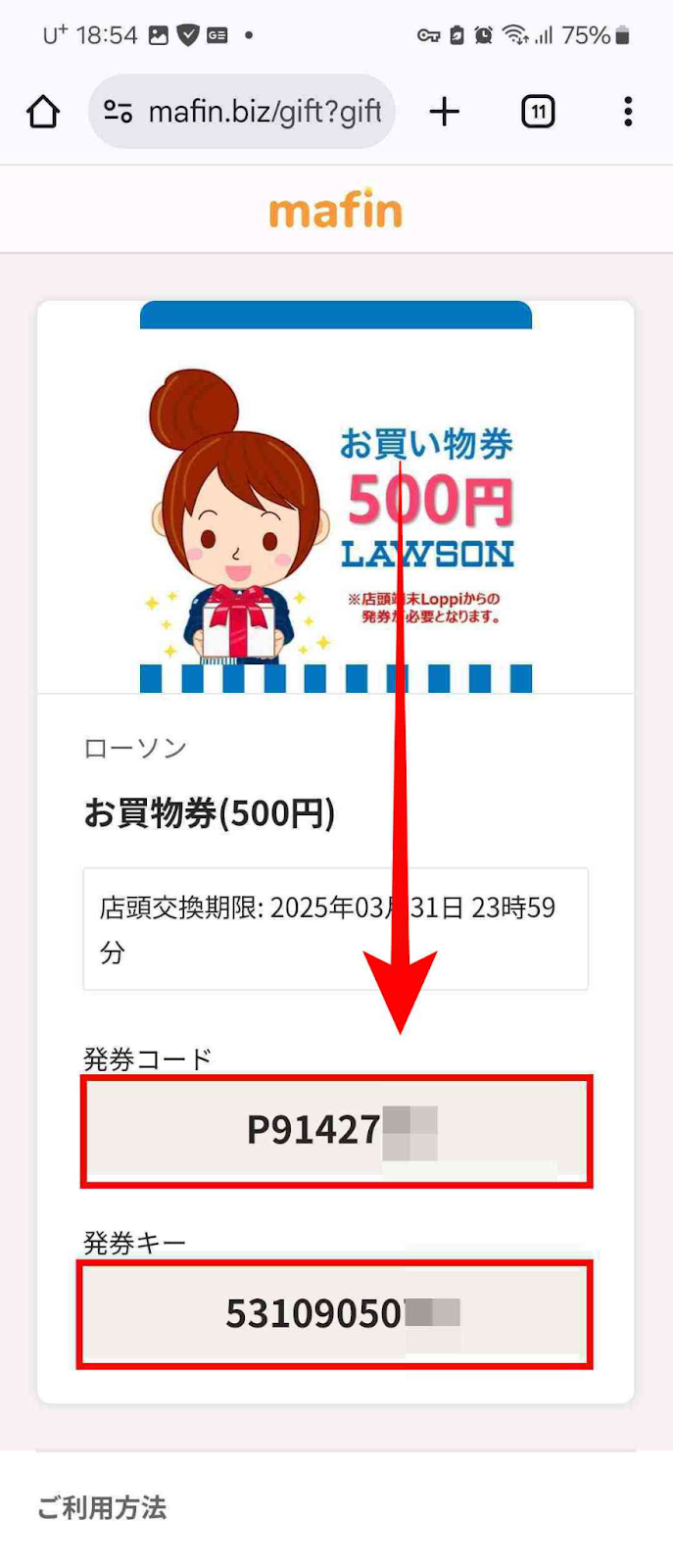 Loppi 기계에서 발급받은 500엔 바우처인데 바로 출력해서 나와요.