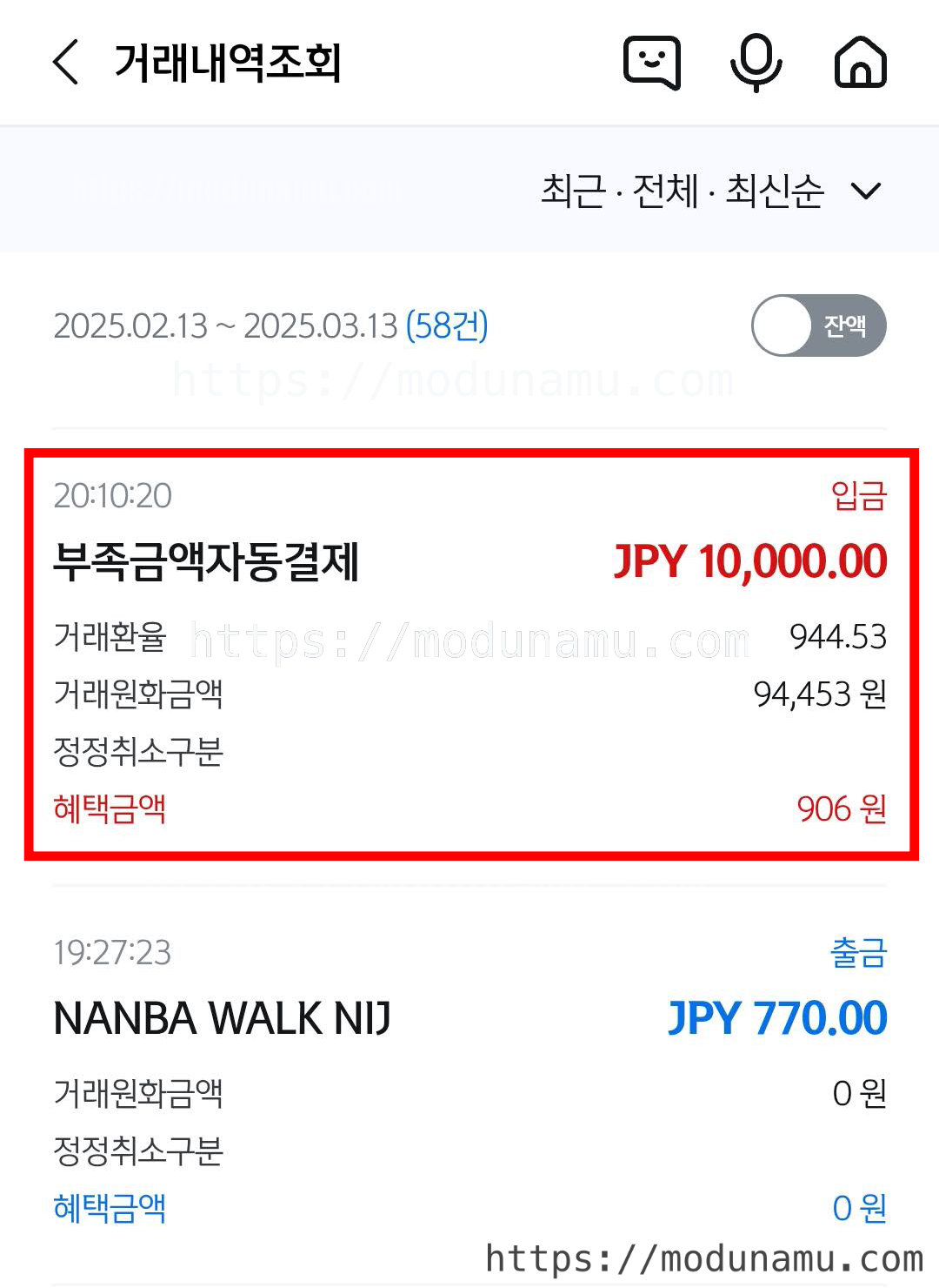 앱으로 통장 내역을 확인해 보면 SEVEN BANK에서 10,000 JPY로 출금되었어요. 바로 아래에 보면 부족금액자동결제 되어 94,453원이 환전되었습니다.
