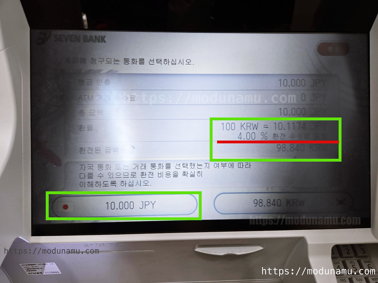 환전을 안 하고 왔기 때문에 세븐일레븐에 들려서 10만 엔가량 환전하기로 했습니다. 트래블체크카드는 출금 및 환전 수수료가 무료라고 했는데, ATM기의 마지막 화면에서는 수수료 4%가 포함되어 계산되어 있었습니다.