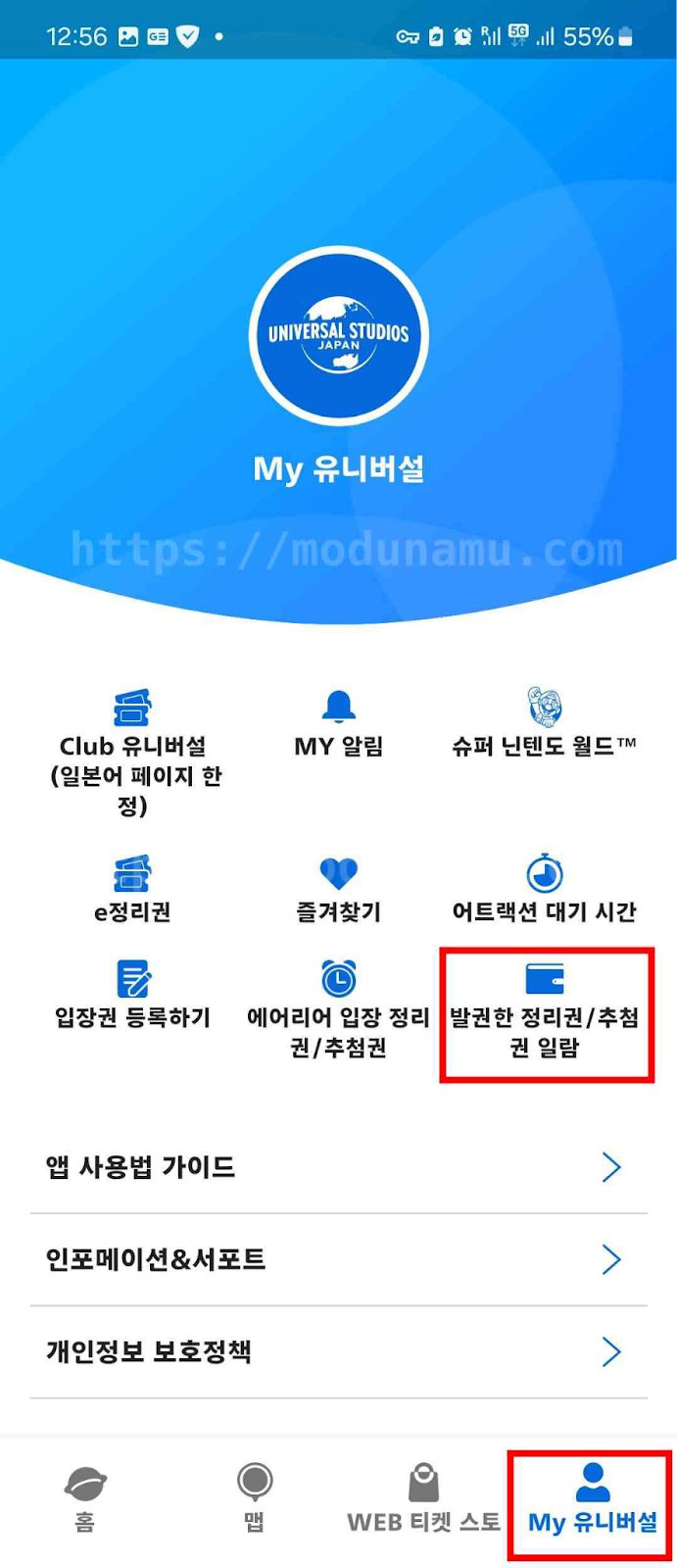4. My 유니버설 > ‘발권한 정리권/추첨권 일람’ 클릭