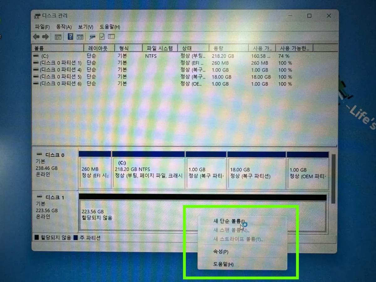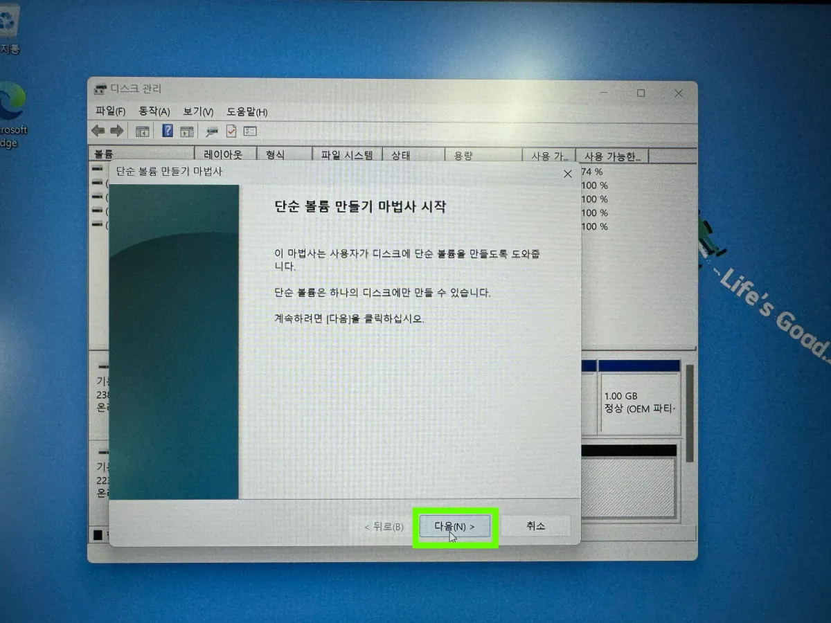 - 클릭 : 하드 디스크 파티션 만들기 및 포맷