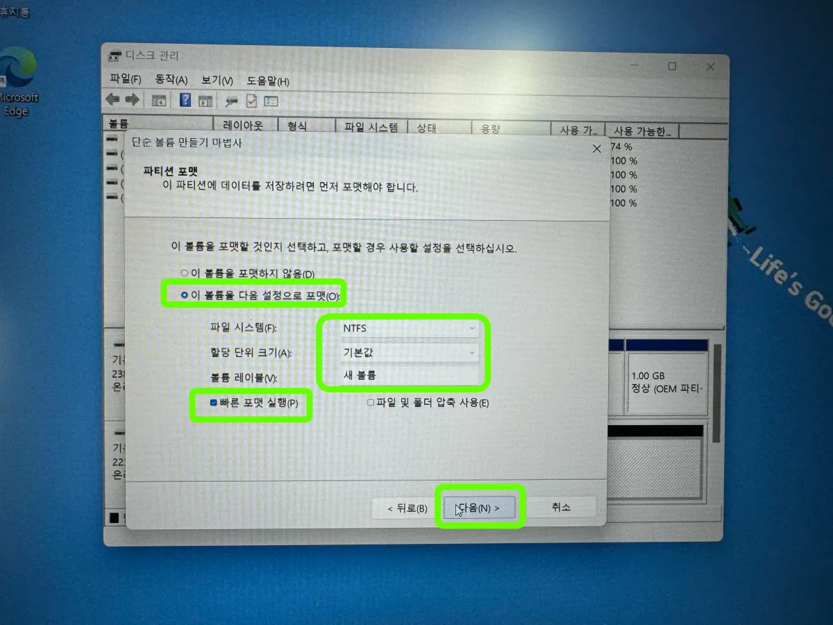 - 포맷 : 파티션 포맷, 파일시스템 : NTFS, 할당 단위 크기 : 기본값, 볼륨 레이블 : 새볼륨, 빠른 포맷 실해 체크 후 ‘다음'