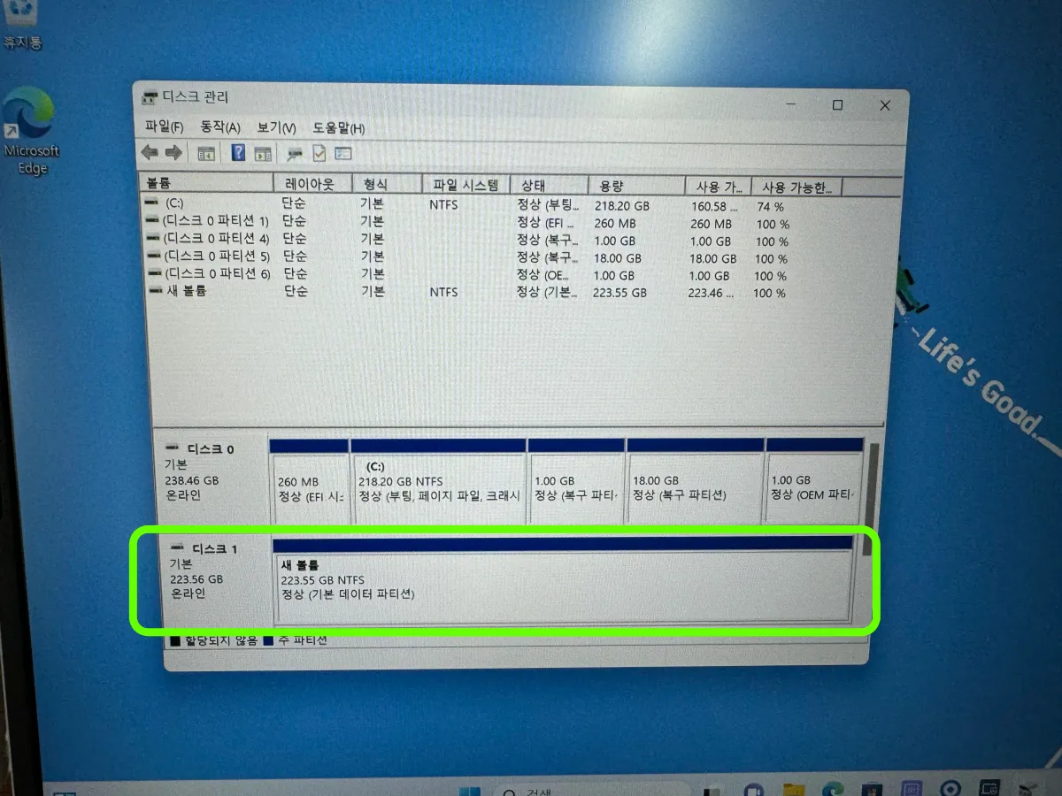 - 확인 : 디스크 관리에서 디스크1이 새볼륨으로 생성된거 확인