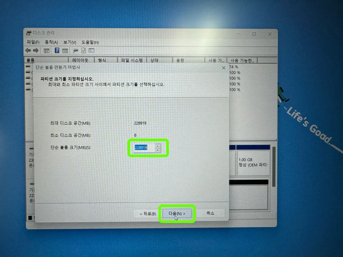 6. 크기 : 파티션 크기를 지정, 통으로 사용할거라 ‘228919’ 전체 사이즈 입력하고 ‘다음'
