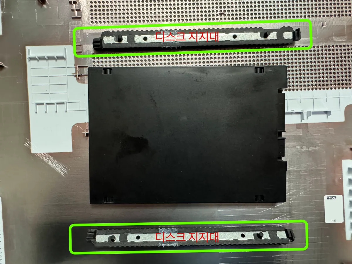 디스크 같은 경우는 이미 공간이 할당되어 가짜 디스크가 있기 때문에 그 모양 그대로 지지대 붙이고 전원선만 연결하여 됩니다. 왼쪽 지지대가 깊숙이 들어가기 때문에 끝까지 넣어면 딱 맞게 조립됩니다.