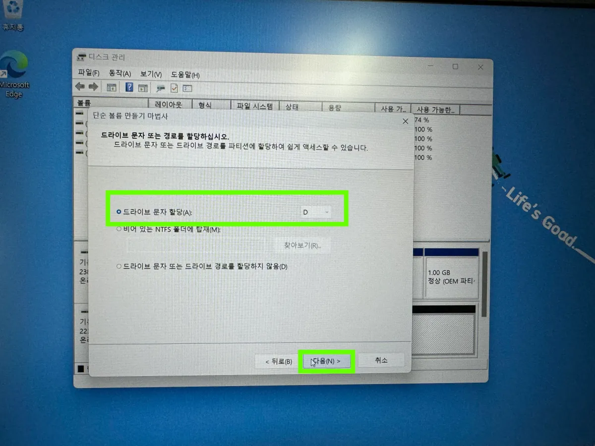 - 문자 : 드라이브 문자 또는 경로 할당, D로 확인하고 ‘다음'
